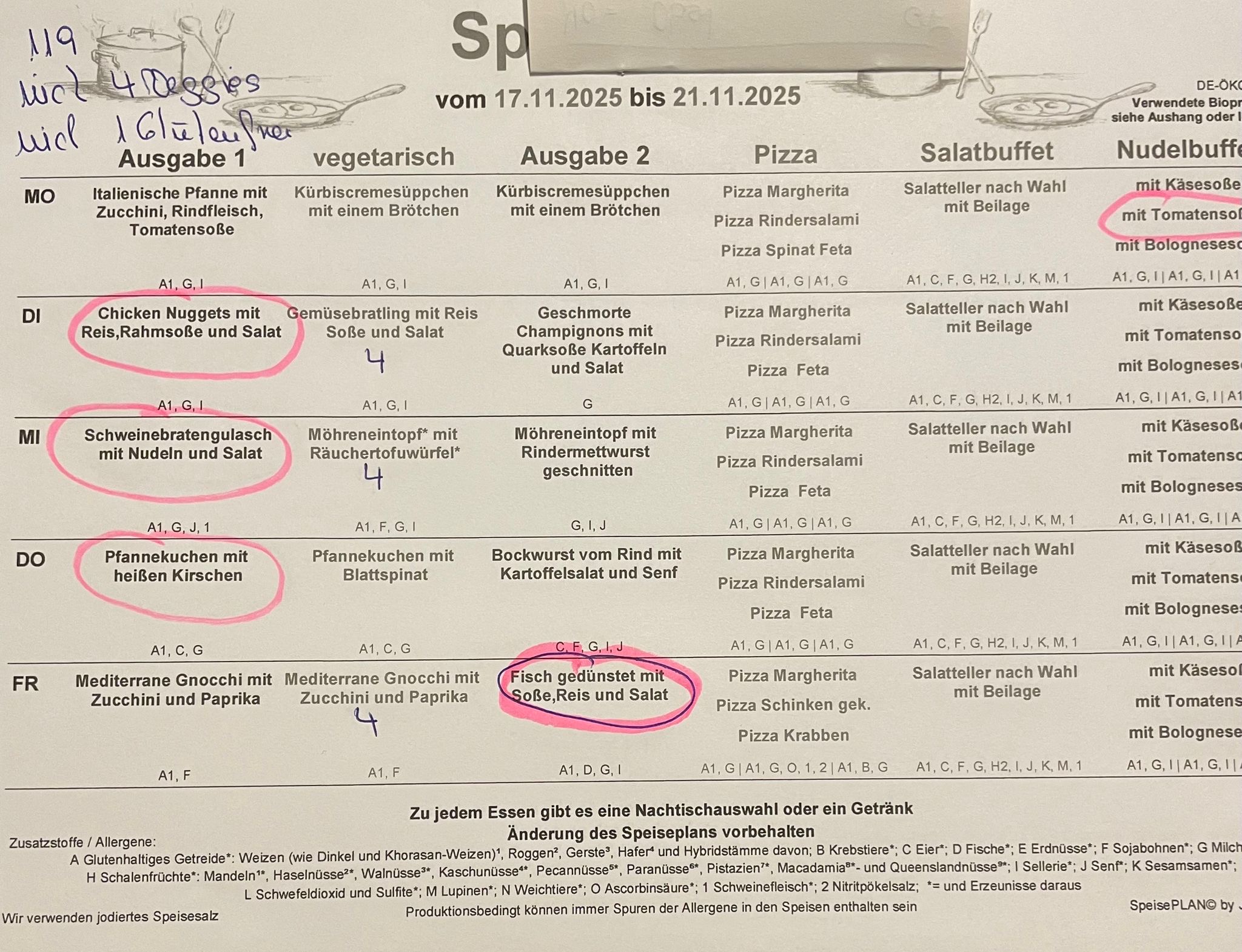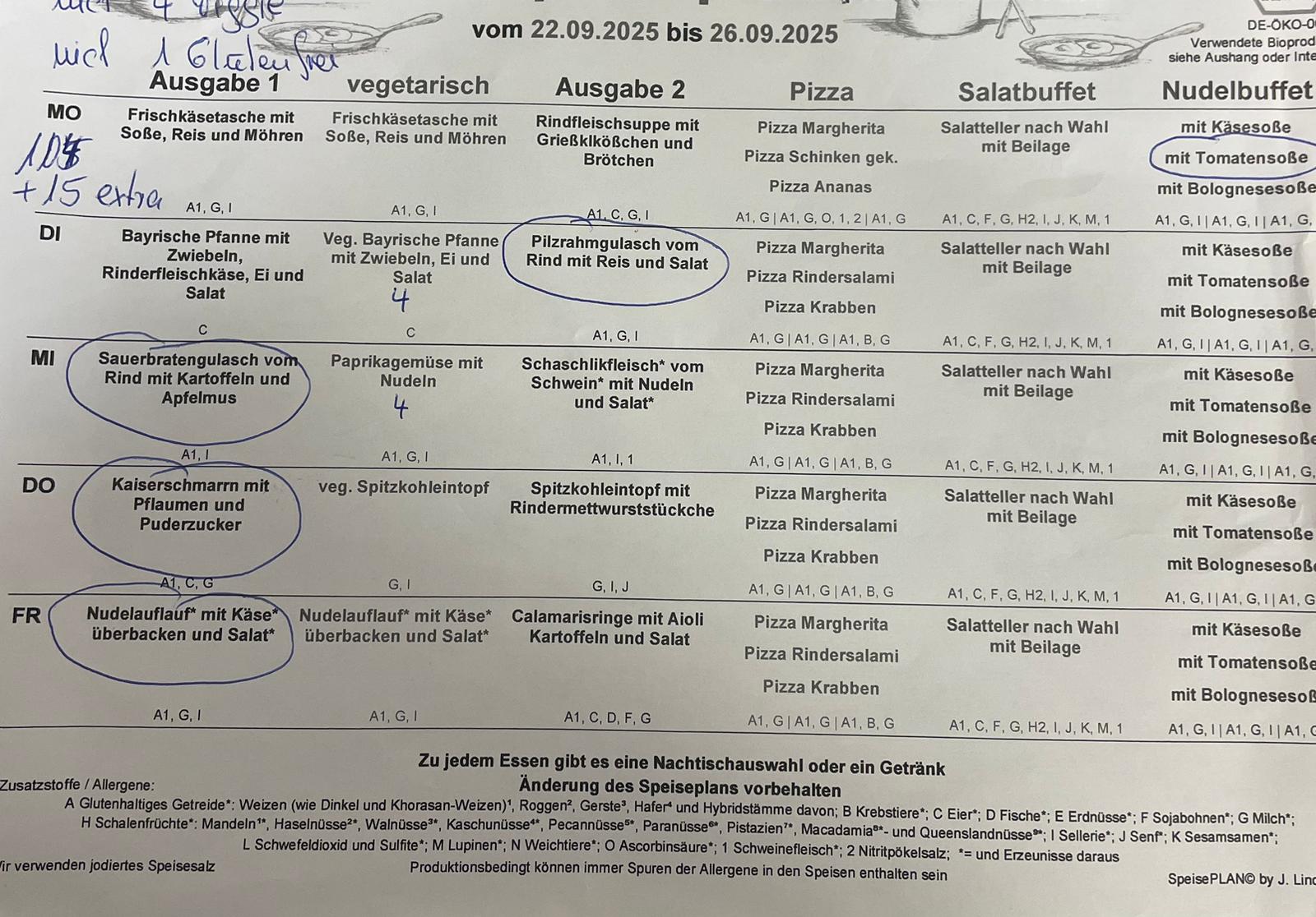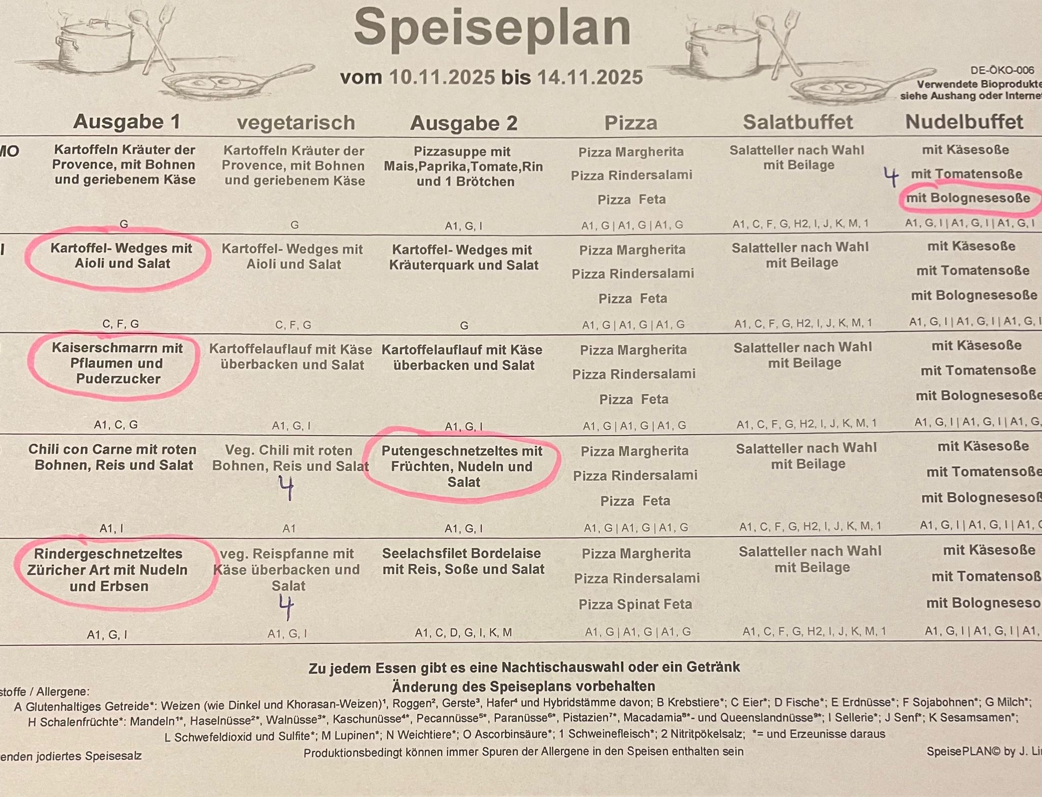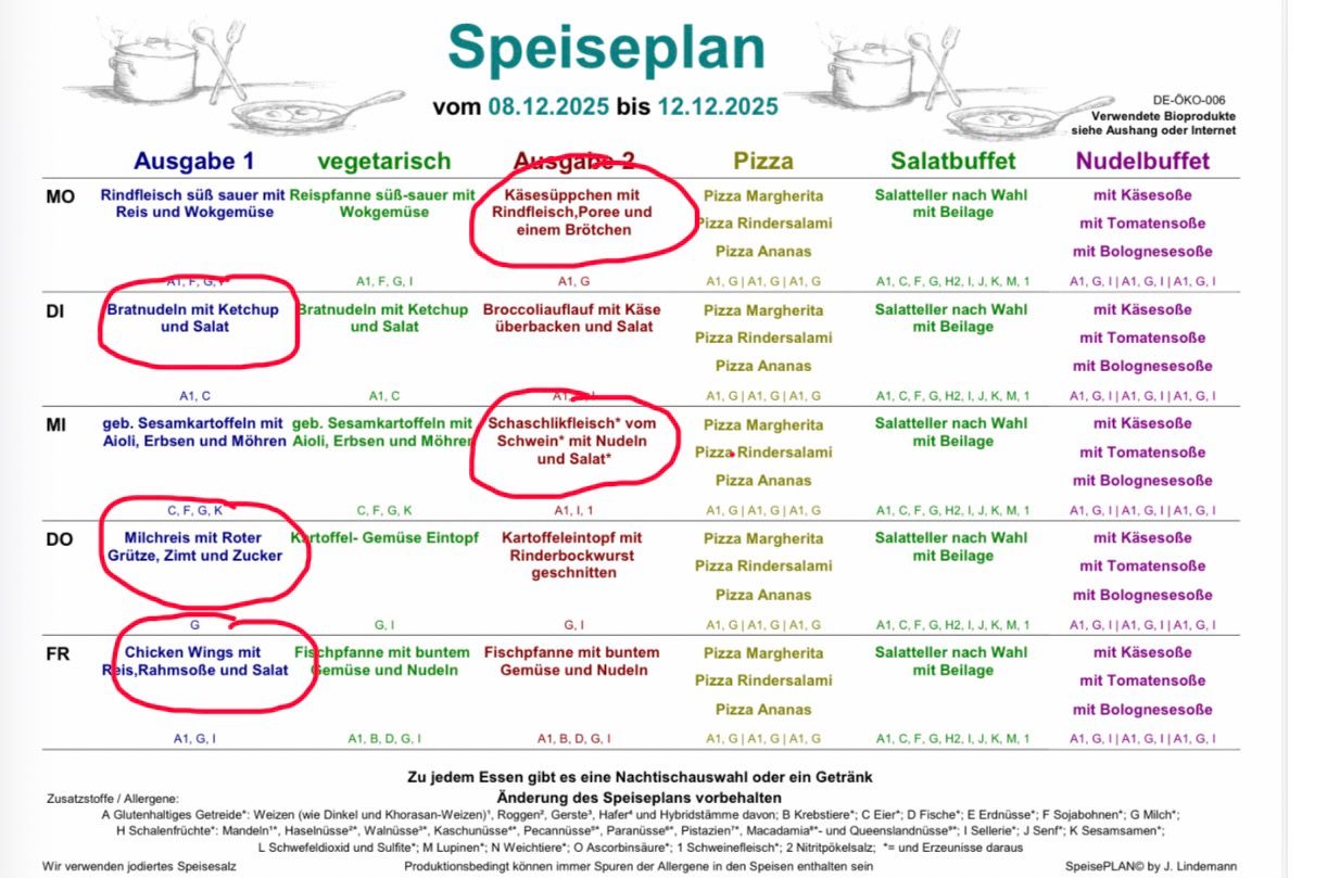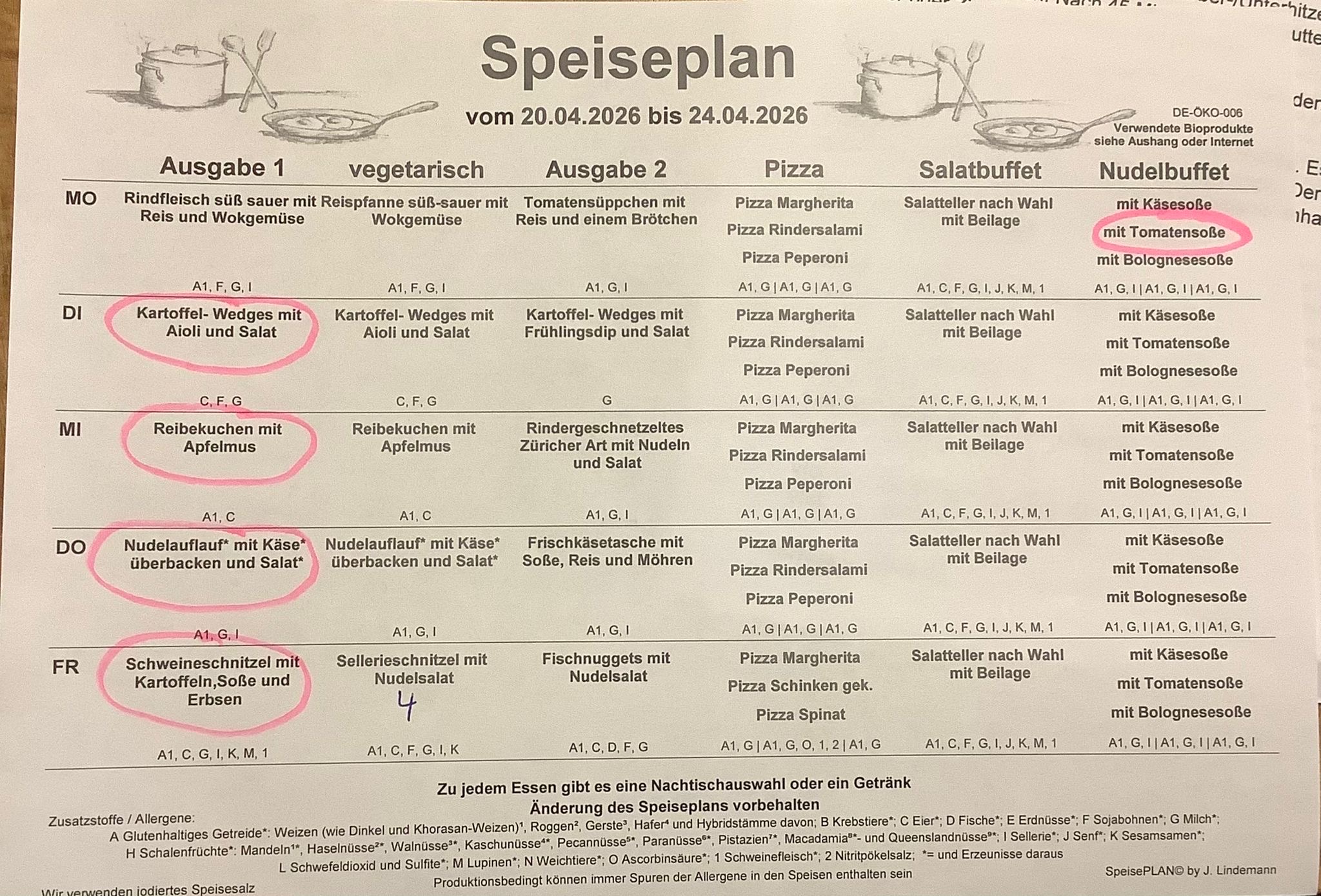 wir können nun Ihrem Wunsch nach mehr Information nachkommen und stellen hier wöchentlich den Essenplan für die Mittagsversorgung im Offenen Ganztag ein. Dabei möchten insbesondere auf die gesonderte Ausweisung der Zusatzstoffe wegen eventueller Unverträglichkeiten hinweisen.