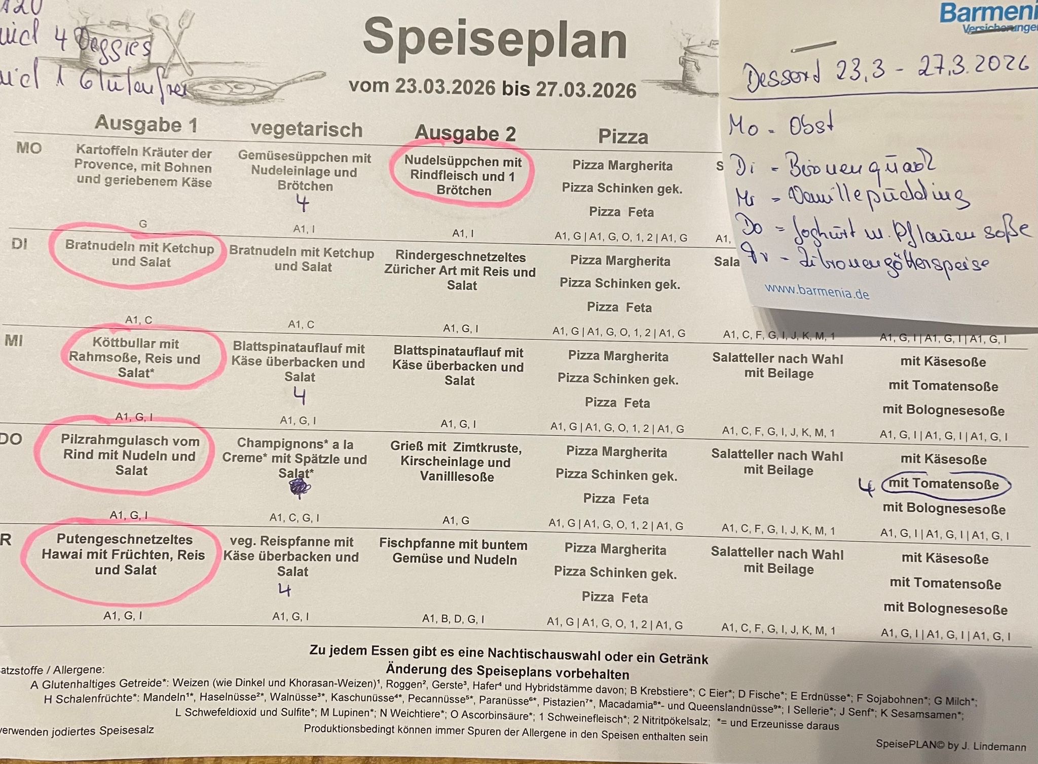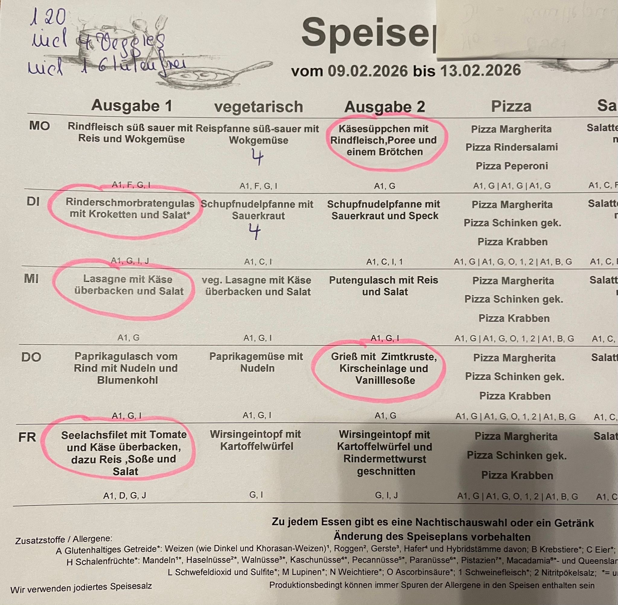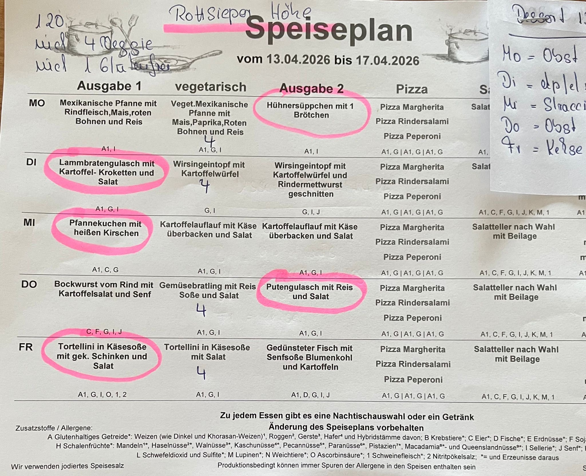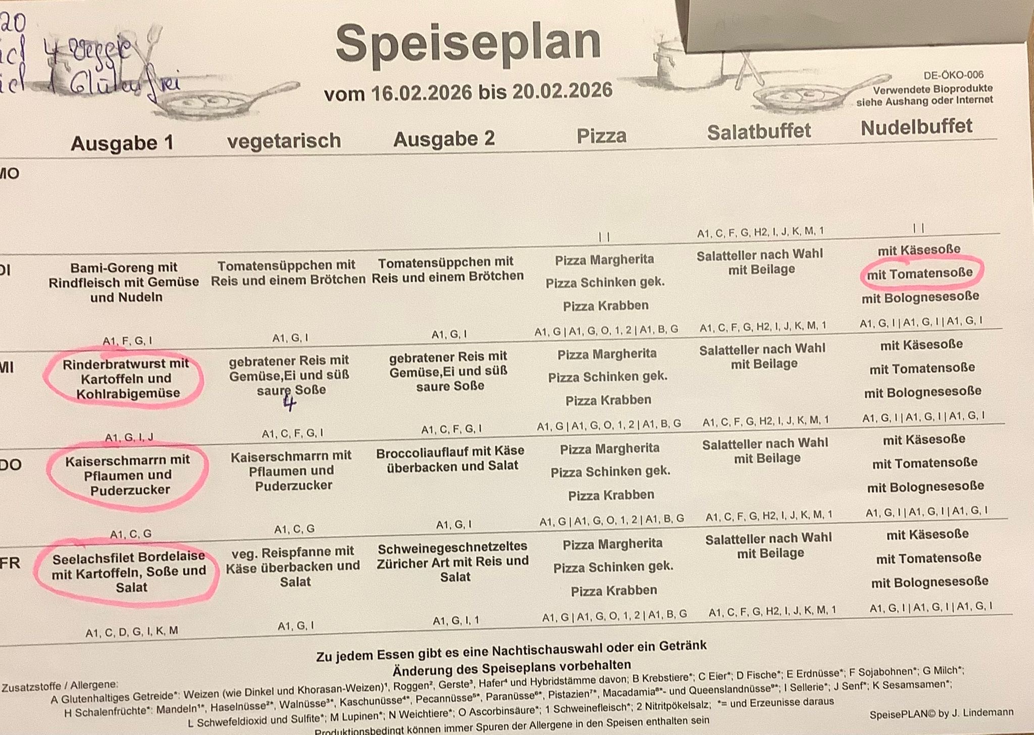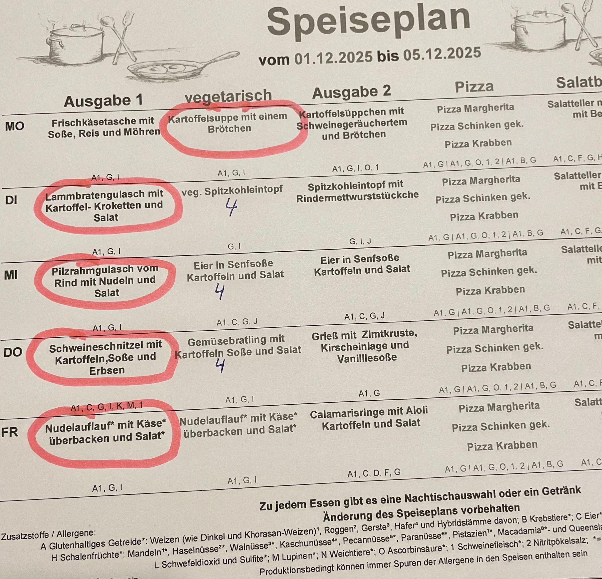 wir können nun Ihrem Wunsch nach mehr Information nachkommen und stellen hier wöchentlich den Essenplan für die Mittagsversorgung im Offenen Ganztag ein. Dabei möchten insbesondere auf die gesonderte Ausweisung der Zusatzstoffe wegen eventueller Unverträglichkeiten hinweisen.
